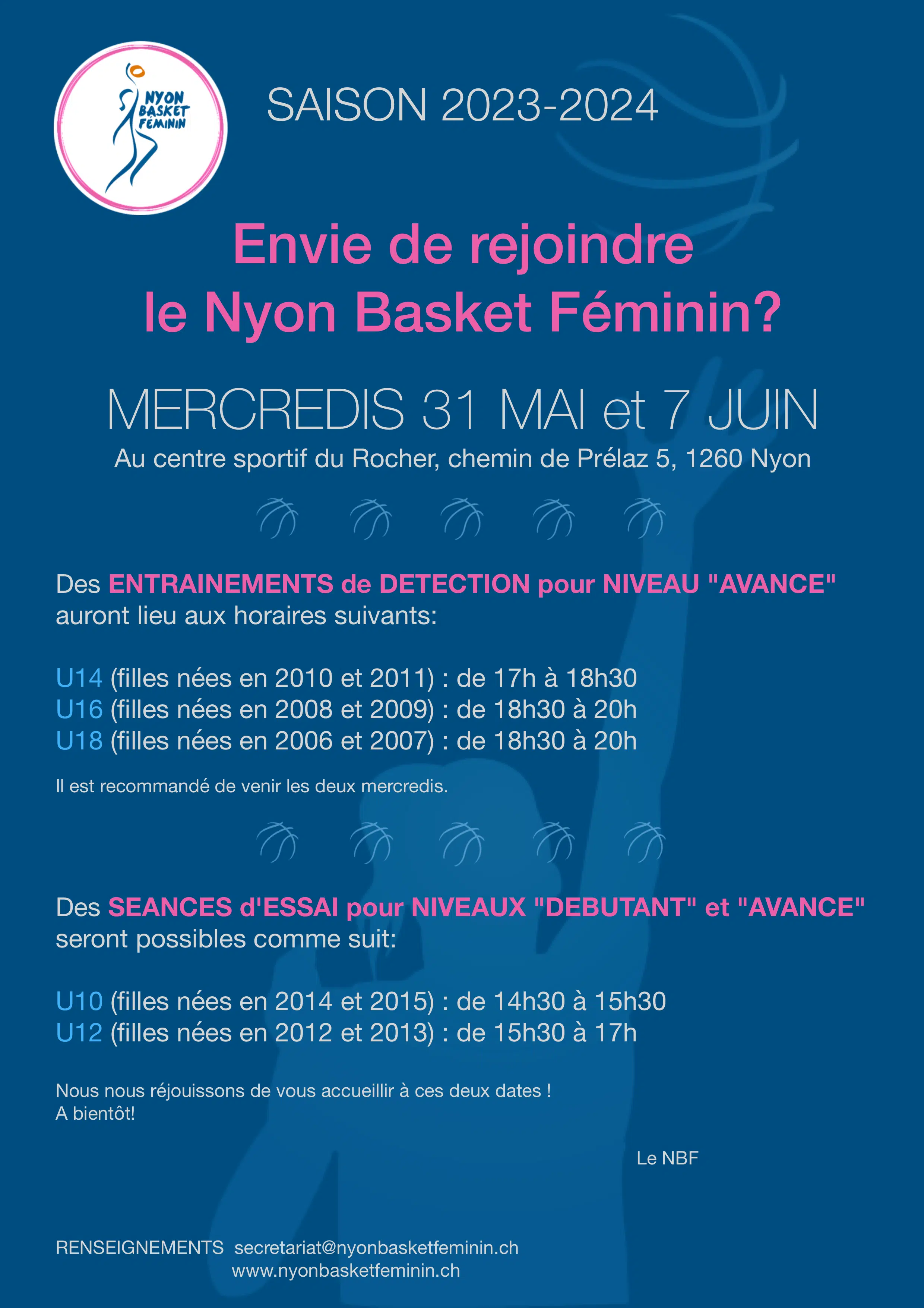 Les mercredis 31 mai et 7 juin, le Nyon Basket Féminin organise 2 journées de détection pour plusieurs catégories.